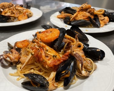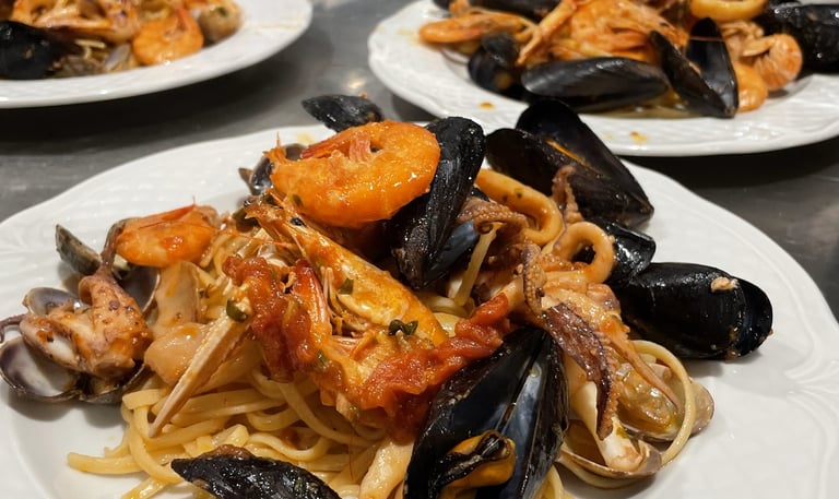 Le nostre linguine ai frutti di mare (dette anche allo SCOGLIO) combinano cozze, vongole, gamberi e calamari in un’armonia di sapori che richiama le onde del Mediterraneo. Il segreto è nel condimento leggero, fatto con olio extravergine d’oliva, aglio e prezzemolo fresco.